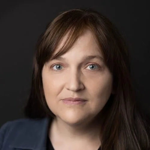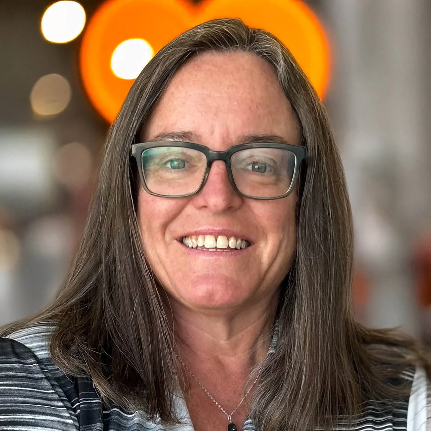 • A woman with long brown hair, glasses, and a light-colored shirt, smiling against a blurred background of city lights at night.