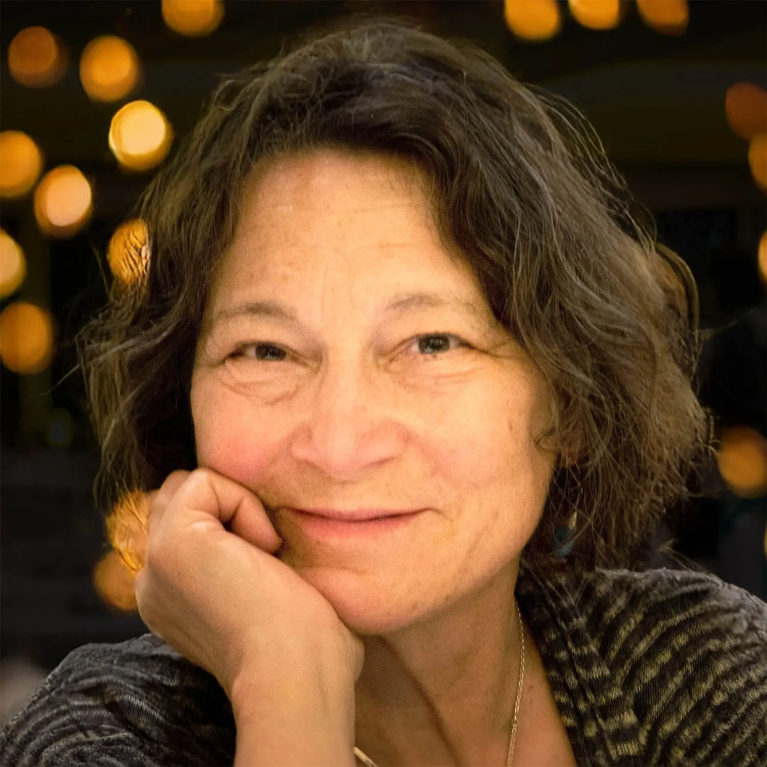 • Close-up of a middle-aged woman with curly brown hair, smiling gently, resting her chin on her hand, in an indoor setting with yellow decorations in the background.