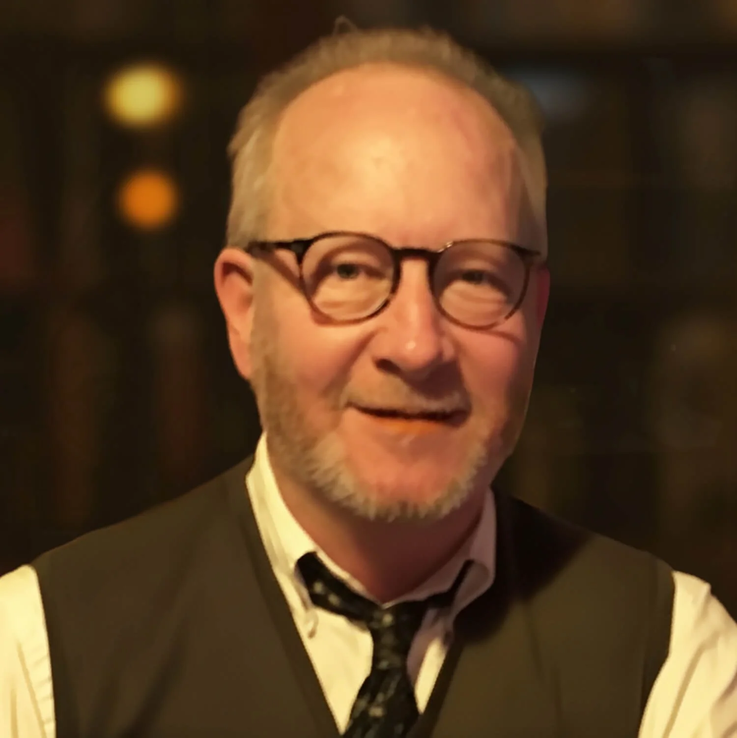 • A middle-aged man with light blonde hair and a beard, wearing glasses and a red sweater, sitting indoors near a window with bright sunlight.